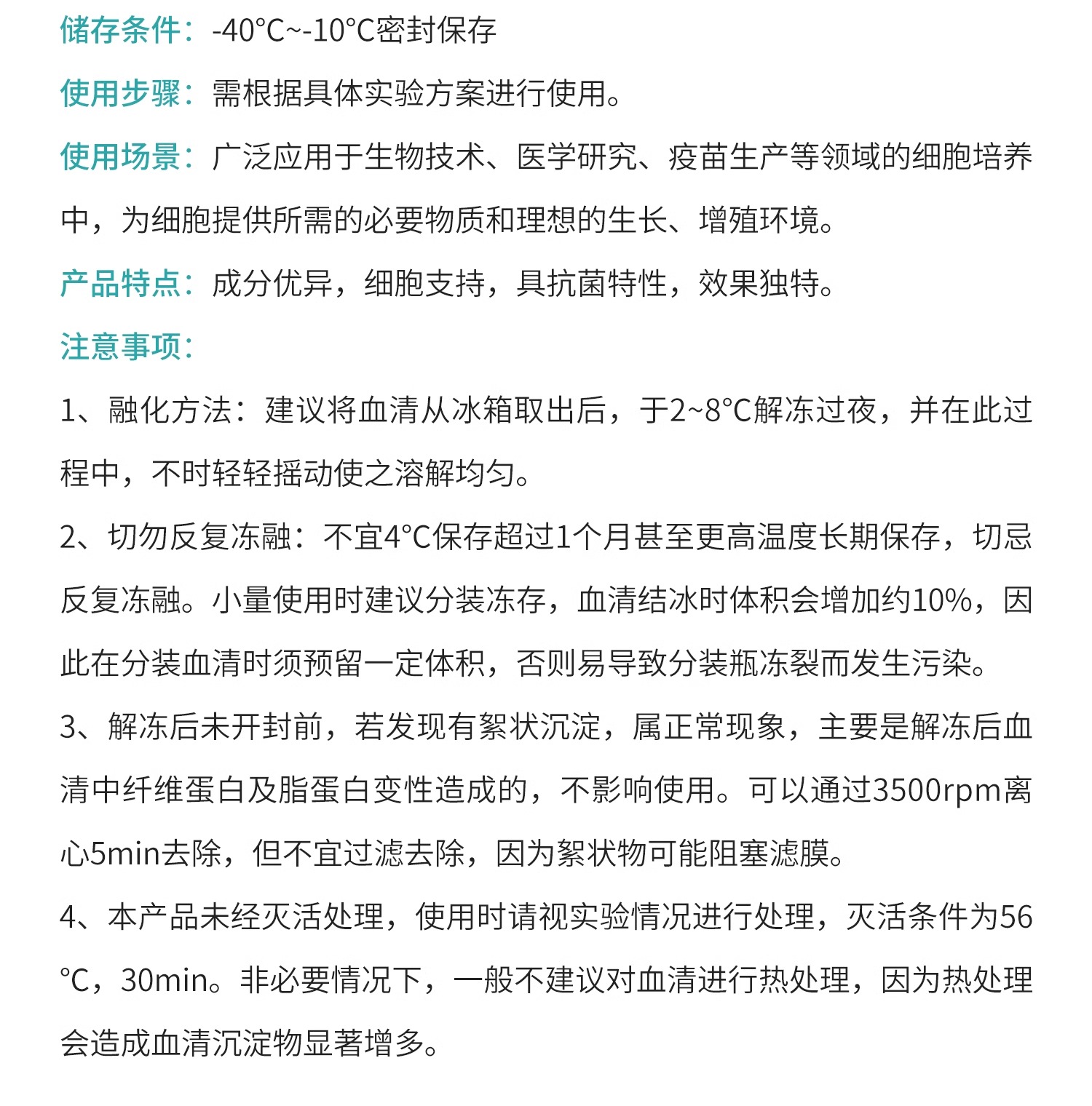 2、切勿反復凍融:不宜4°C保存超過1個月甚至更高溫度長期保存,切忌反復凍融。小量使用時建議分裝凍存,血清結冰時體積會增加約10%,因此在分裝血清時須預留一定體積,否則易導致分裝瓶凍裂而發生污染。
